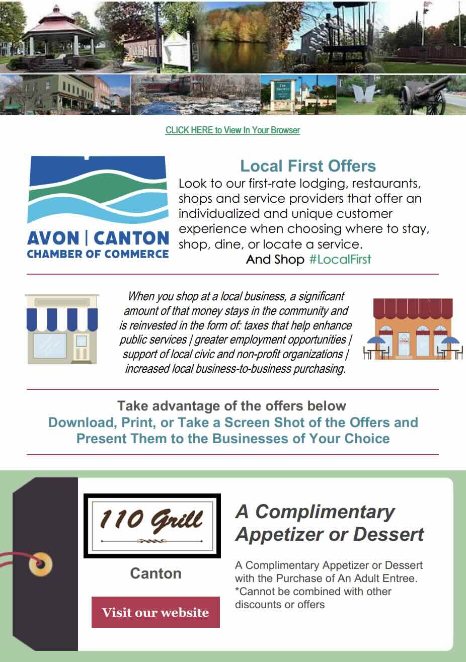 This program does not constitute an endorsement, either implied or explicit, by the Avon Chamber of Commerce of the products or services being offered, nor their quality. Offers are subject to change at the discretion of each business without notice.